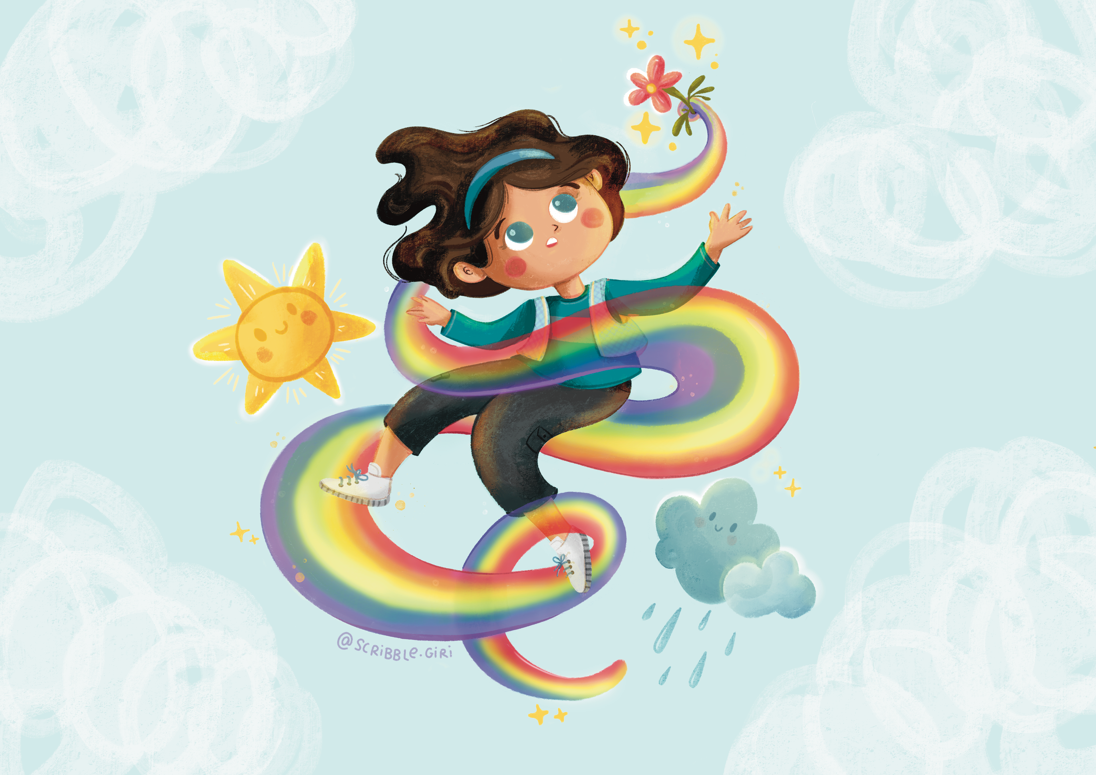 An illustration reminder that sometimes it takes both sunshine and showers for something beautiful to grow. This bright, joyful piece is inspired by the month of Shravan, when the skies can’t decide between rain and shine, so they give us both… and all the colours in between.